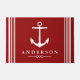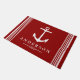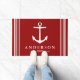 Elegant white nautical anchor in the centre. The background is a maritime red colour with personalised family name text in white. This doormat is elegant, chic, and would make a great impression on your house guests as they are welcomed to your home!