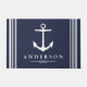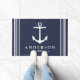 Anchors away! Greet your guests with this statement making white nautical anchor doormat.. The background is a dark navy blue colour with personalised family name text in white. This doormat is elegant, chic, and would make a great impression on your house guests as they are welcomed to your home!