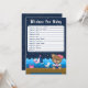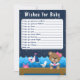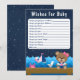 This cute and fun wishes for baby card features a nautical sailor girl bear on a wooden deck with a seagull and a crab. In the background there is a cute pink bird on a sailboat, ocean waves and a navy blue starry night sky. The text combines bold and serif fonts for a stylish and modern look. This is perfect for a nautical themed baby shower.