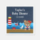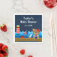 This cute and fun napkin features a nautical sailor girl bear on a wooden deck with a seagull and a crab. In the background there is a red and white lighthouse, a cute bird on a sailboat, ocean waves and a navy blue starry night sky. The text combines bold and serif fonts for a stylish and modern look. This is perfect for a nautical themed baby shower.