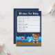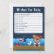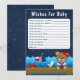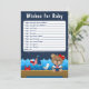 This cute and fun wishes for baby card features a nautical sailor girl bear on a wooden deck with a seagull and a crab. In the background there is a cute red bird on a sailboat, ocean waves and a navy blue starry night sky. The text combines bold and serif fonts for a stylish and modern look. This is perfect for a nautical themed baby shower.