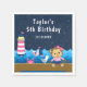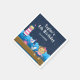 This cute and fun napkin features a nautical sailor girl monkey on a wooden deck with a seagull and a crab. In the background there is a pink and white lighthouse, a cute bird on a sailboat, ocean waves and a navy blue starry night sky. The text combines bold and serif fonts for a stylish and modern look. This is perfect for a nautical themed birthday party.