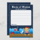 This cute and fun words of wisdom card features a nautical sailor girl monkey on a wooden deck with a seagull and a crab. In the background there is a cute red bird on a sailboat, ocean waves and a navy blue starry night sky. The text combines bold and serif fonts for a stylish and modern look. This is perfect for a nautical themed baby shower.