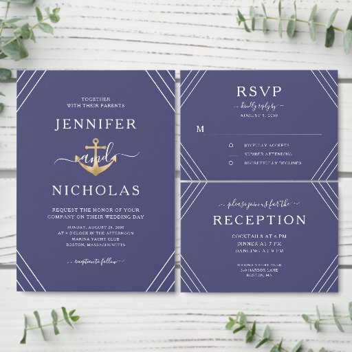 Nautical Gold Anchor Stripes Navy Blue Wedding Invitation