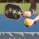 A nautical black and gold Pickleball paddle with 4 natural starfish against a background like a midnight blue sky.Personalise with Initials and Monogram on each side.