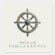 This square sticker features a beautifully detailed ship's wheel in muted grays, warm browns, and subtle golds, creating an elegant nautical theme. The design is minimalist, with the wheel centered on a clean white background, evoking a sense of adventure and gratitude. Below the wheel, simple sans-serif text reads "thank you" followed by names in slightly larger letters, adding a personal touch to this versatile sticker perfect for expressing appreciation or decorating items with a maritime flair.
