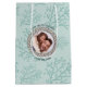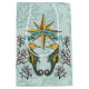 On the Front: This captivating design features two graceful seahorses encircling a nautical star, complemented by a gold scroll for a customisable message. Against a backdrop of tropical mint corals, this gift bag exudes a tranquil and summery vibe.