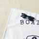 This image features a boat name, wheel and anchor on a navy blue and white striped background.