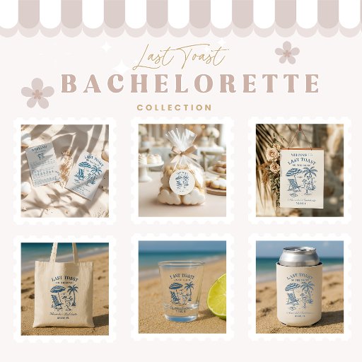 Celebrate her last sail before the veil with this vintage-inspired bachelorette weekend set. Featuring a playful beach scene with a cocktail, palm tree, and striped umbrella, this design brings retro charm to any coastal or cruise getaway. The matching itinerary card helps guests stay organised while adding to the fun theme. Personalise with the bride’s name, location, and date to create a stylish and coordinated set perfect for a toast on the coast.