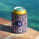 Nautical can cooler with sailing boat lifebelts over navy blue and white stripes. There's a monogram circle on the front and back to add your own initial