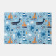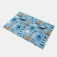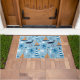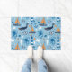 Nautical design doormat features a light blue background with orange sailboats, crabs, octopus, ship wheels, whales, lighthouses, starfish, and anchors!