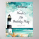 Beautiful birthday party poster with a nautical black and white lighthouse, starfish and shells. Perfect for a birthday party. The words can be changed to suit your own details or requirements