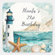Beautiful birthday party sticker with a nautical black and white lighthouse, starfish and shells. Perfect for a birthday party. The words can be changed to suit your own details or requirements