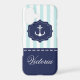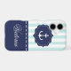 Trendy nautical design with mint and white stripes pattern, together with navy blue color and anchor silhouette. Customizable iPhone case.