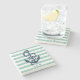 Set your summer cocktails on these nautical striped stone coasters. Design features a mint green stripe background with a navy anchor illustration and your initials.