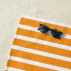 Cute monogram beach towel with a horizontal orange stripes design. This item has an orange and white circular border and orange and white customisable lettering, Great for adding a fresh style to your trips to the beach and pool.