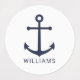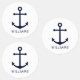 Modern Minimalist Nautical Round Labels feature navy blue anchor with personalised name in navy blue modern sans serif font style on white background.