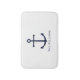 Modern Minimalist Nautical Bath Mat featuring navy blue anchor with personalised name in navy blue modern sans serif font style on white background.