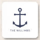 Modern Minimalist Nautical Coasters featuring navy blue anchor with personalised name in navy blue modern sans serif font style on white background.
