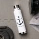 Modern Minimalist Nautical Water Bottle features navy blue anchor with personalised name in navy blue modern sans serif font style on white background.