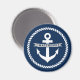 Nautical navy blue anchor and rope custom fridge magnet. Round magnet Birthday gift idea for sailor, boat captain, skipper, fisher, boating friends, yachting family, couple etc. Add your own personalised family name or sailing quote. Cute design for beach home with maritime decor. Also great as party favour for wedding guests.