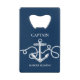 Personalise this credit card style bottle opener with Captain’s name or boat name. It features a classic nautical navy blue and white design with anchor and ship’s rope.