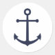 Modern Minimalist Nautical Round Sticker feature navy blue anchor on white background.