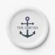 Personalised nautical paper plate featuring a navy blue anchor design and your custom family name in a classic serif font.