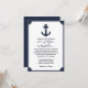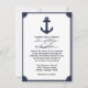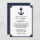 Nautical Navy Blue Anchor Wedding Invitation - The design is a navy blue outline with rounded in corners and a anchor. The text is navy blue on top of a white background. The back of the card is matching navy blue. The paper by default is set to basic invitation stock, but can be changed by clicking 'choose your style' then using the Paper drop down box pick one of the options. Each invitation comes with a white envelope. To change the font, font size, or font colour, click the customise button below the Nautical wedding invitation. Note you may have to customise it if certain wording is too long and so it fits the design better. If your satisfied with the font setup, you can use the personalise feature to change the demonstration information to your personal details. Clicking the small images of the front/back of the card with change to that side so it can be altered. When done check the information you applied is correct and that you have no spelling errors on both sides of the card.