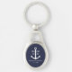 Designed with a white anchor illustration, it features personalised bride and groom monogram, name, and wedding date in a white serif font on a navy blue background.