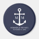Designed with a white anchor illustration, it features personalised bride and groom monogram, name, and wedding date in a white serif font on a navy blue background.