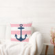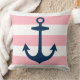 Stylish and chic square accent pillow design features a coastal pattern of wide white cabana stripes with a navy blue boat anchor. The light pink background colour can be customised.