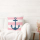 Stylish and chic square accent pillow design features a beachy white and pink cabana striped pattern with navy blue boat anchor. The pink background colour can be customised.