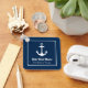Nautical square keychain features a simple, stylish navy blue and white coastal style design with boat anchor accent. Personalize the custom text with the name of your boat along with her location city and state.