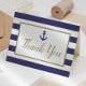 This nautical themed card features a navy blue and white background. The words "Thank You" appear beneath a small navy blue anchor on a gold-framed white rectangle. The perfect thank you card for a nautical themed baby shower, bridal shower, or other event.