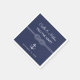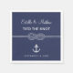 Modern nautical theme of anchor and tied rope overlaying navy blue with script and modern typography paper napkins for weddings.