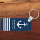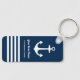Nautical keychain features a simple, stylish navy blue and white coastal style design with boat anchor accent and horizontal stripes detail. Personalise the custom text with the name of your boat along with her location city and state.