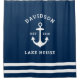 A striking nautical shower curtain featuring a bold anchor with your family name in elegant script, established year, and "Lake House" in classic serif type. The navy blue background with white graphics and a coordinating stripe at the bottom creates a polished coastal look. A stunning focal point for a lake house, boat house, or nautical-themed bathroom. All text is fully customizable.