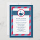 This cute nautical baby shower invitation features a friendly navy whale with heart-shaped water splashes, set against a bold navy blue and red polka dot and stripe design. The classic nautical colour combination is perfect for a baby boy celebration. A coordinating whale pattern dresses up the back of the card. All wording is fully customisable for your event.