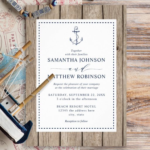 When you are having a beach-inspired wedding and you want a little rustic flare this wedding suite accomplishes both. This design features a rustic wood background, a dash line border, and a nautical navy blue anchor.