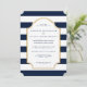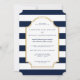 A modern wedding invitation that's stylish and trendy with nautical stripes of navy and white and a frame of gold and white. Clean lined, contemporary typography is formatted for an up to date look that's bold and yet elegant.