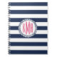 Preppy-chic spiral notebook features wide navy blue and white stripes with your three-initial monogram in hot pink, inscribed inside a circular nautical rope badge.