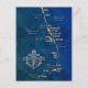Nautical design map with anchor depicting all of the towns of the Outer Banks of NC, starting in the north with Carova, then Corolla, Duck, Southern Shores, Kitty Hawk, Kill Devil Hills, Nags Head, South Nags Head, Rodanthe, Waves, Salvo, Avon, Frisco, Buxton, Hatteras, and finally Ocracoke. Many islands are also labelled such as Bodie Island, Pea Island, Hatteras Island, and Ocracoke Island. Lastly, you'll see the major bodies of water identified as the Atlantic Ocean and Albemarle Sound as well as several smaller sounds, bays, and inlets.