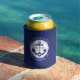 This patriotic inspired nautical family can cooler has a red, white and blue anchor decorated with stars and stripes. A white circle with a rope edge is behind the anchor. Design includes a family name, date established, and town and state for you to personalise with your own details. Background is navy blue. Perfect for family reunions and Independence Day celebrations.