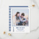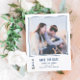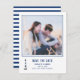 A modern blue and white themed save the date with a border to frame your special photo, and a one of a kind hand drawn lighthouse. The backside has stripes. Customisation options are available.