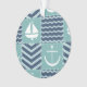 A quilt inspired pattern of stormy turquoise squares, decorated with a white sailboat and anchor, and deep navy blue squares, accented with paler blue chevrons and waves, is accented by white stitching to create a classic nautical feel.