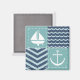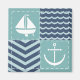 A quilt inspired pattern of stormy turquoise squares, decorated with a white sailboat and anchor, and deep navy blue squares, accented with paler blue chevrons and waves, is accented by white stitching to create a classic nautical feel.