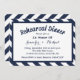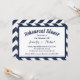 The back of the invitation features a matching navy blue and white stripe pattern.