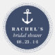 Classic nautical style bridal shower stickers feature a white braided rope border and a ship's anchor illustration on a rich navy blue background, with your custom text -- guest of honour's name, event type, and date. Matches our Nautical Rope Braid bridal shower invitations and accessories.
