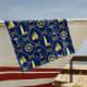 This coastal inspired beach towel features a navy blue and gold nautical pattern of a rope grid with knots, with various nautical icons- lighthouse, sailboat, anchor and ship’s wheel. If you would like more matching products or other colorways, please contact me through Zazzle Chat.